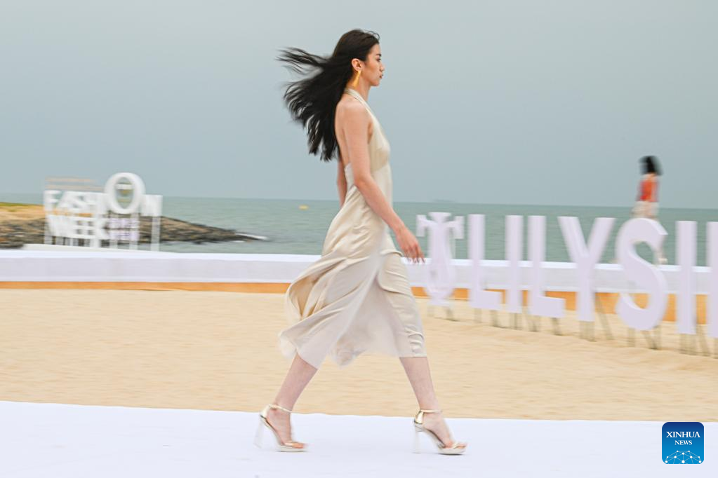 Models present creations during the fashion week at the third China International Consumer Products Expo (CICPE) in Haikou, capital city of south China's Hainan Province, on April 14, 2023. The fashion week, scheduled from April 10 to 15, concluded on Saturday in Haikou. (Xinhua/Yang Guanyu)