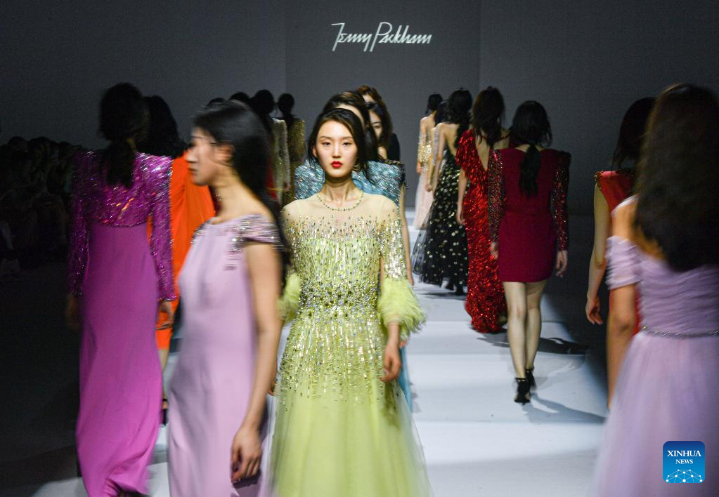 Models present creations during the fashion week at the third China International Consumer Products Expo (CICPE) in Haikou, capital city of south China's Hainan Province, on April 11, 2023. The fashion week, scheduled from April 10 to 15, concluded on Saturday in Haikou. (Xinhua/Pu Xiaoxu)