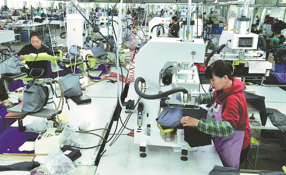 Workers produce sportswear for export at a garment manufacturing enterprise in Taicang, Jiangsu province, on April 6. JI HAIXIN/FOR CHINA DAILY