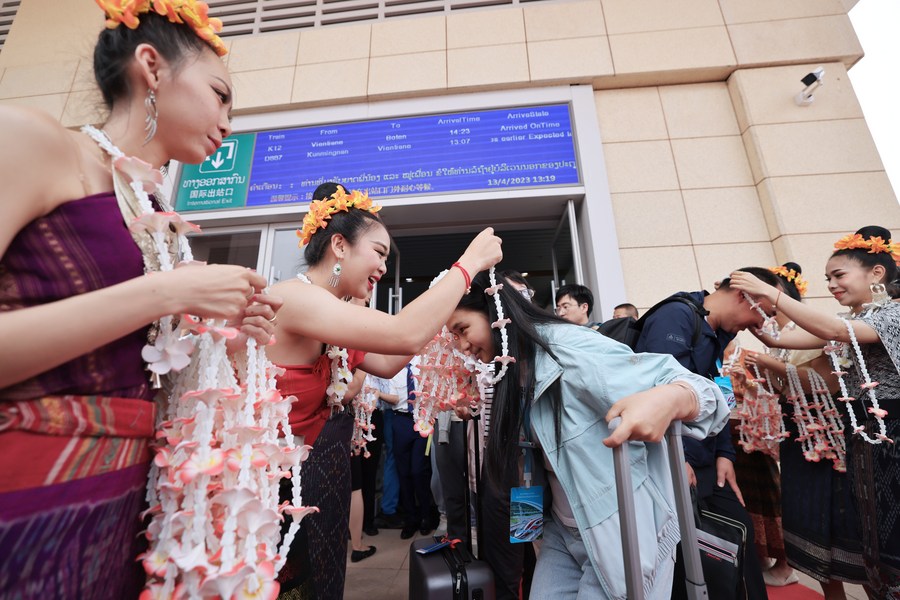 Lao staff members greet passengers taking the first cross-border passenger train from Kunming, the capital of southwest China's Yunnan Province, to Lao capital Vientiane at the Boten Station of the China-Laos Railway in Luang Namtha, Laos on April 13, 2023. (Xinhua/Xing Guangli)