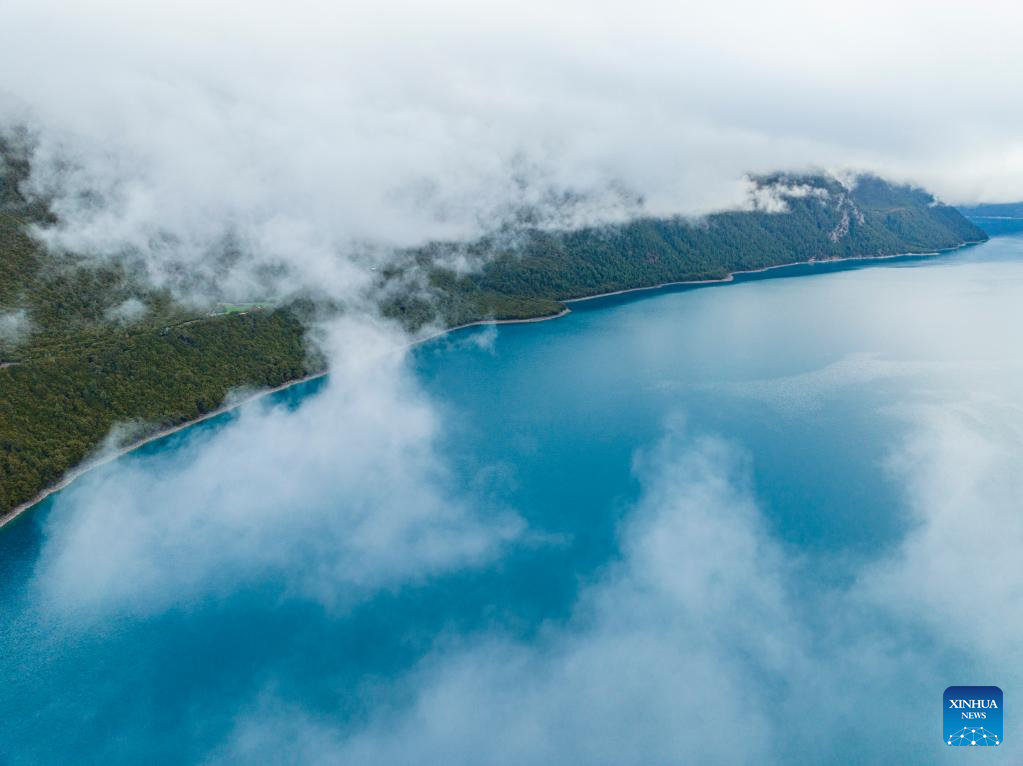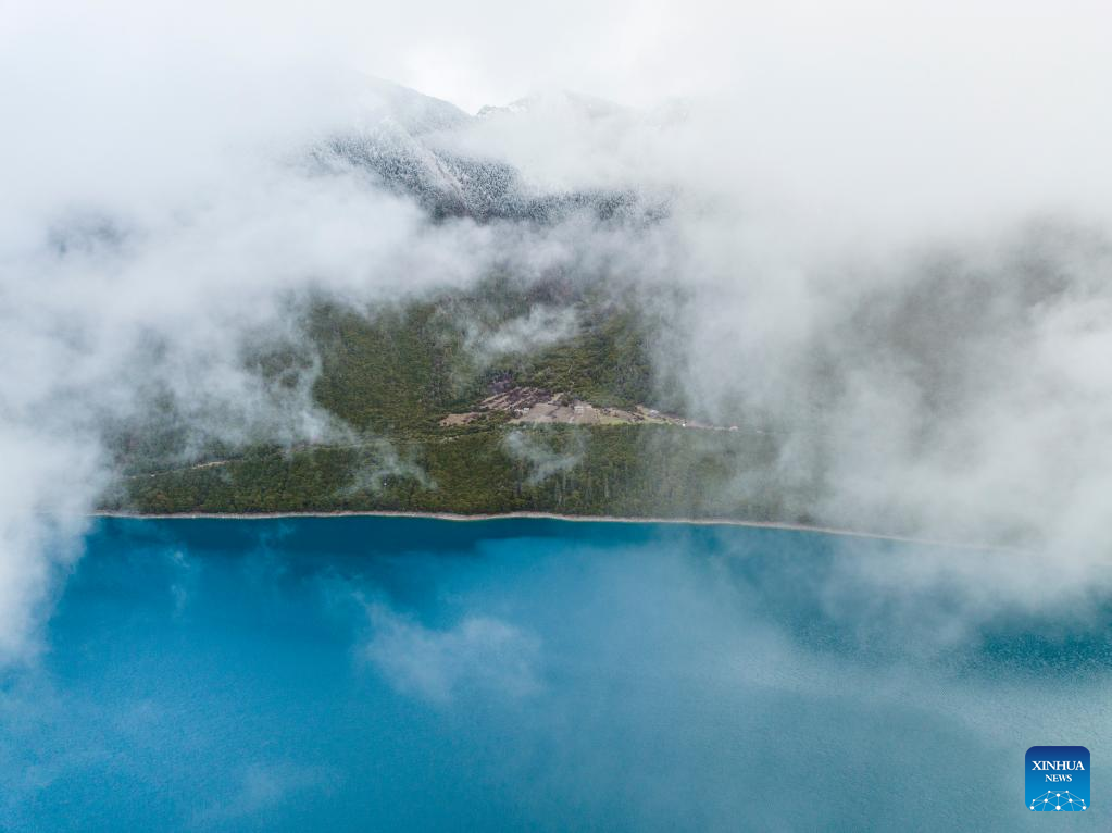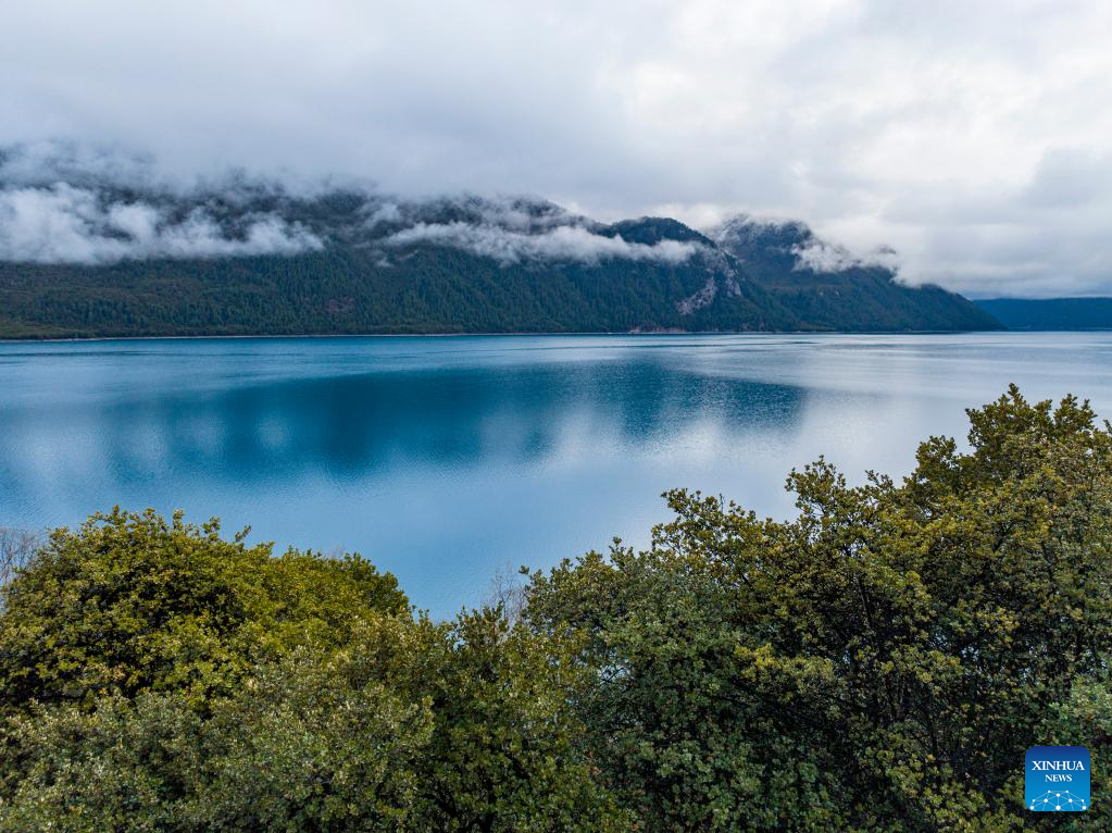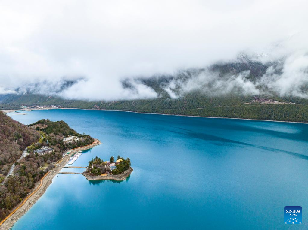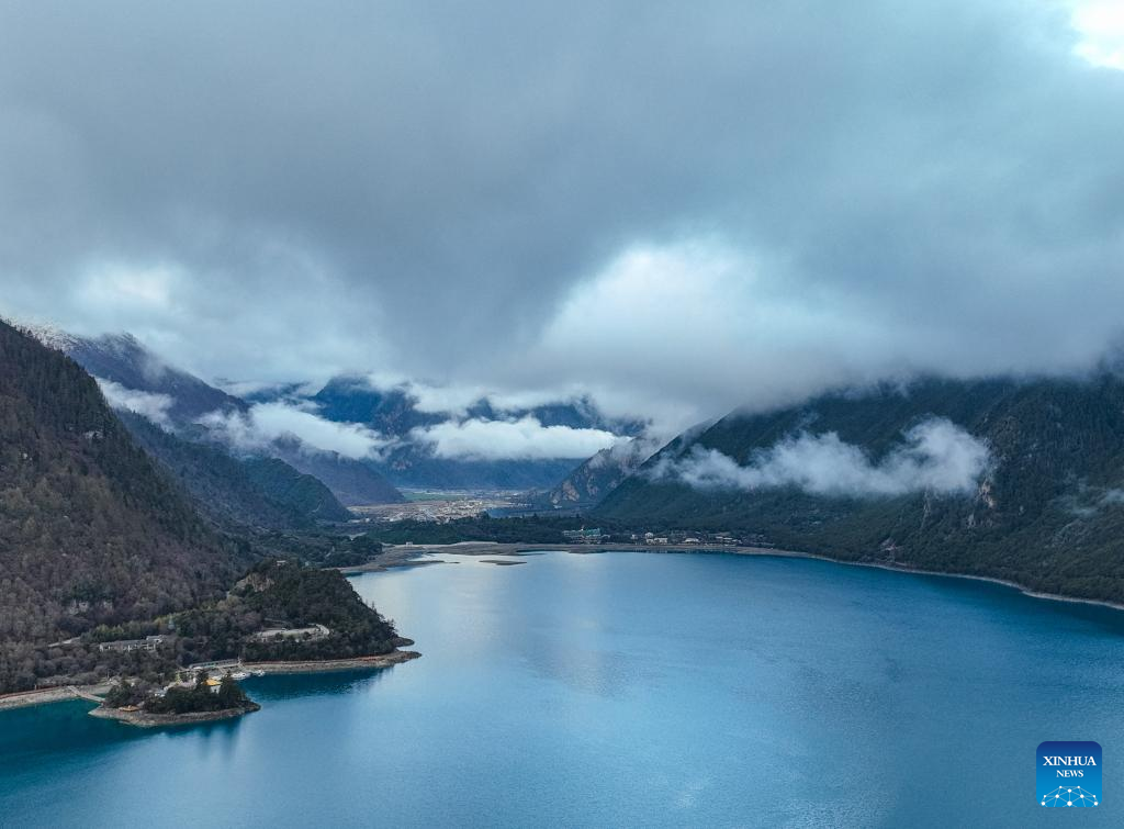 This aerial photo taken on April 17, 2023 shows a view of the Basum Lake in Gongbo'gyamda County of Nyingchi, southwest China's Tibet Autonomous Region. (Xinhua/Cao Bin)