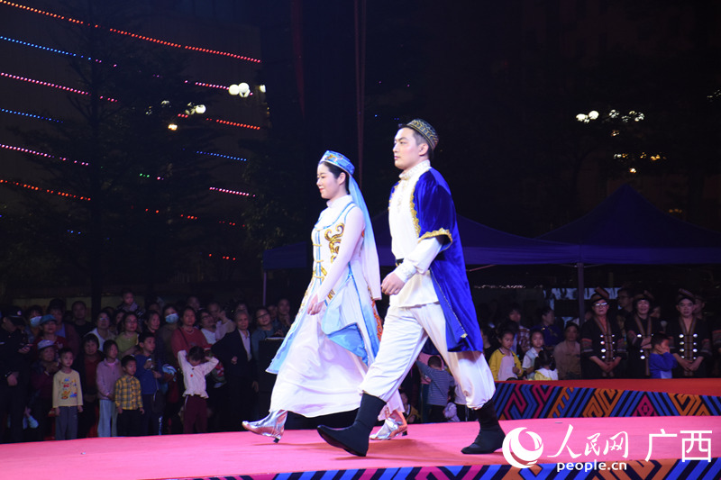 People present Hui ethnic group costume at a fashion show held in Dahua Yao Autonomous County, Hechi city, south China's Guangxi Zhuang Autonomous Region. (People’s Daily Online/Wang Gongxiao)