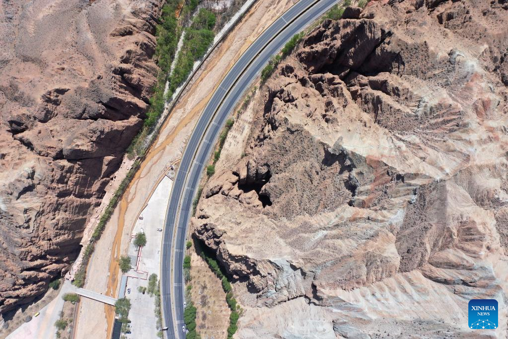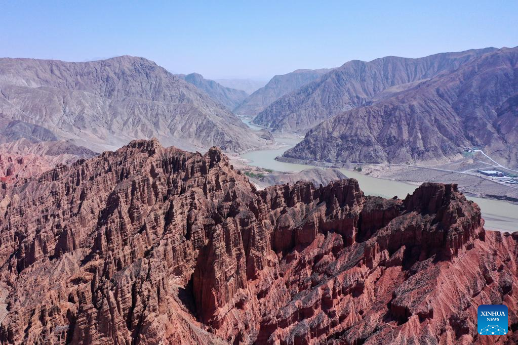 This aerial photo taken on April 17, 2023 shows a view of the Danxia landform in Guide County, northwest China's Qinghai Province. (Xinhua/Zhao Yuhe)