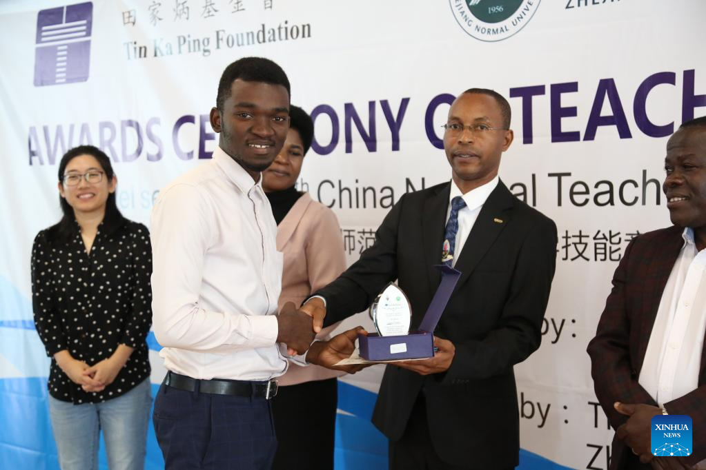 A student (3rd L) receives an award at an awards ceremony of teaching skills competition in Dar es Salaam, Tanzania, on April 17, 2023. (Photo by Herman Emmanuel/Xinhua)