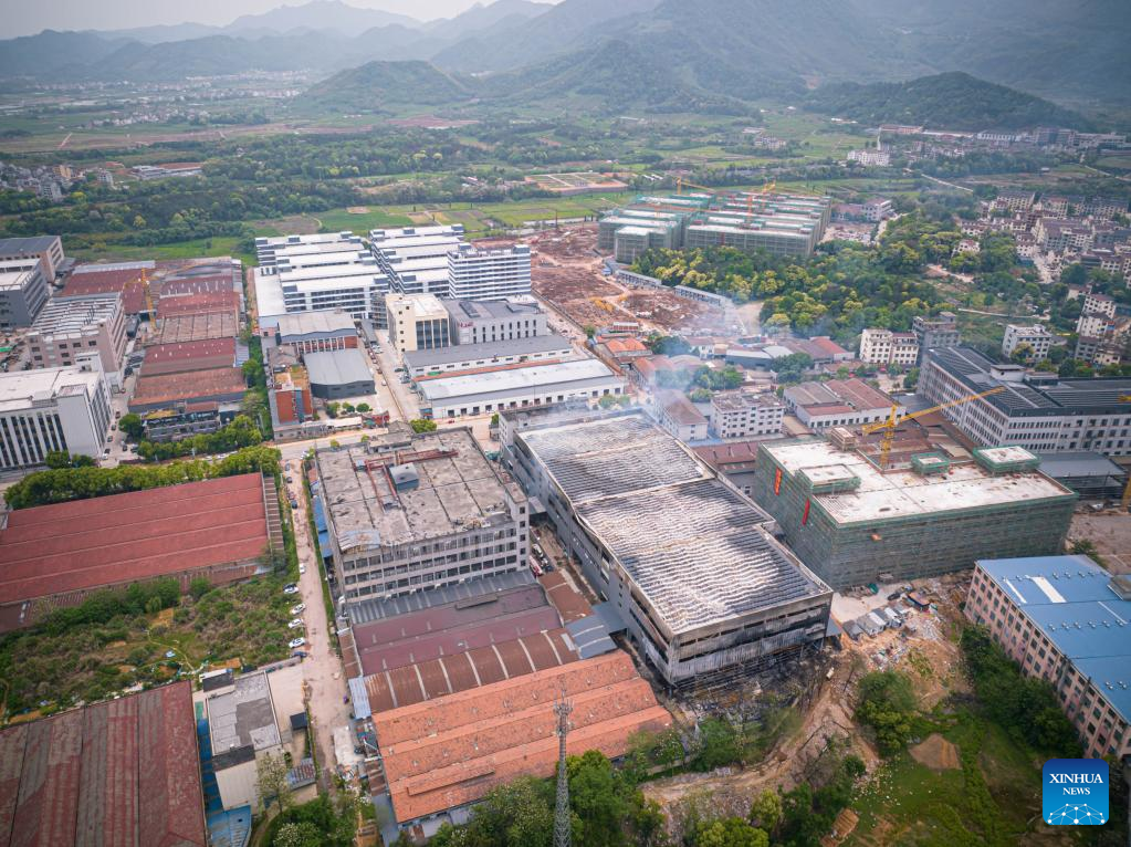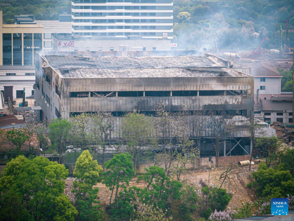 This aerial photo taken on April 18, 2023 shows the site of a fire at a factory building in Wuyi County of Jinhua, east China's Zhejiang Province. (Xinhua/Jiang Han)