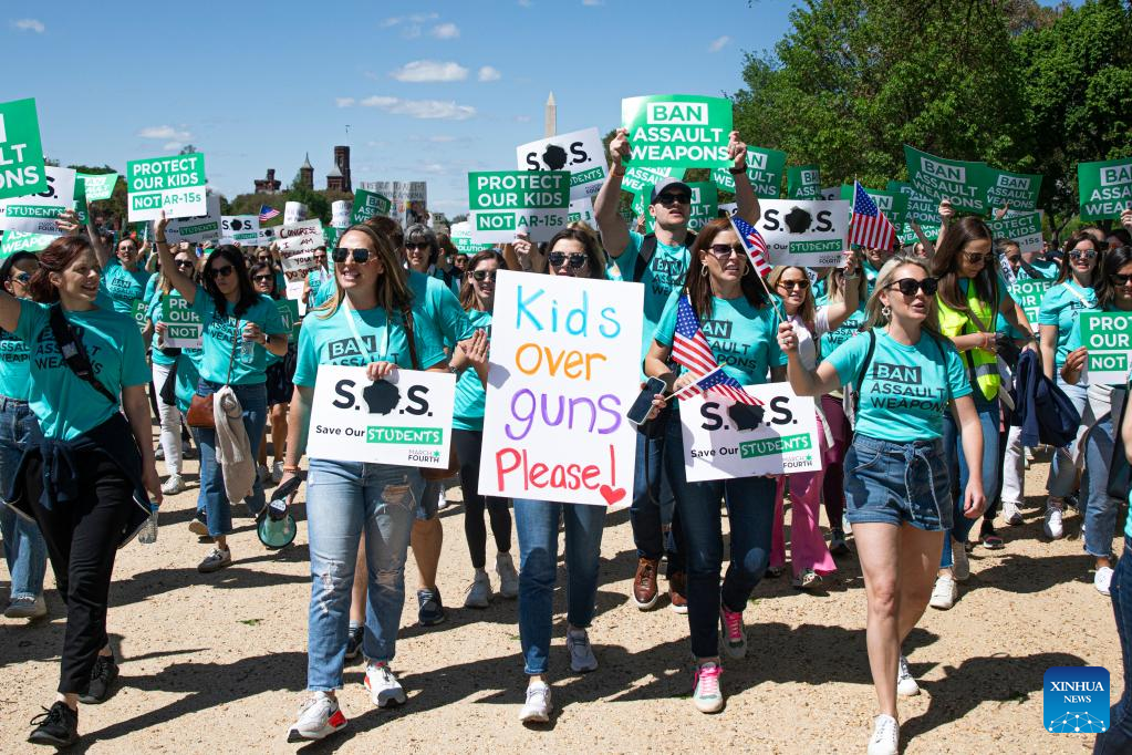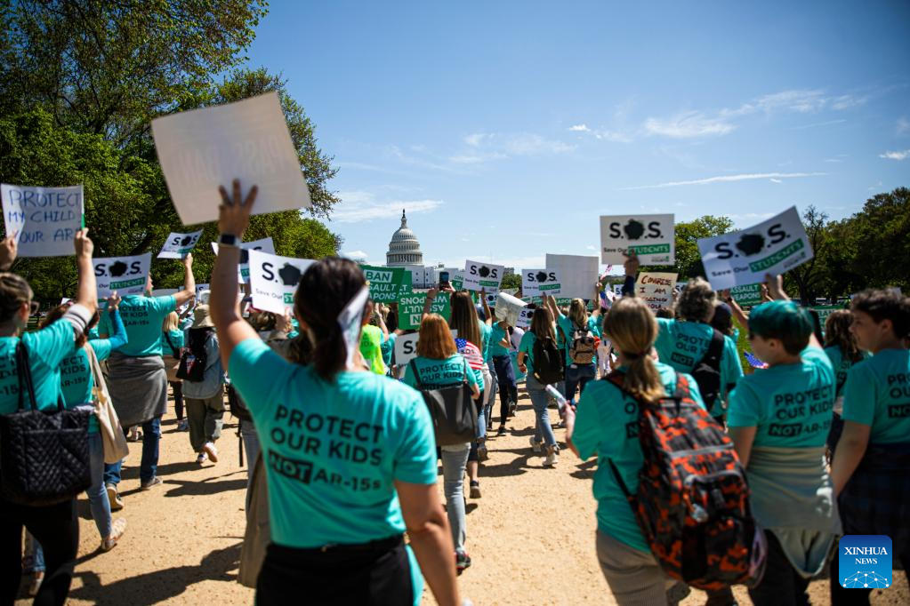 People march to the Capitol to protest for a ban on assault weapons, in Washington, D.C., the United States, on April 17, 2023. (Photo by Aaron Schwartz/Xinhua)