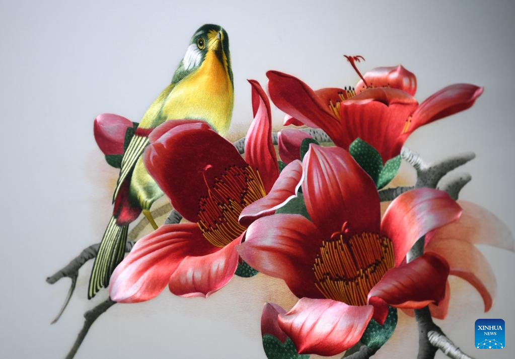 This photo taken on April 4, 2023 shows a piece of Guangzhou embroidery artwork by Wang Xinyuan in Guangzhou, south China's Guangdong Province. (Xinhua/Deng Hua)