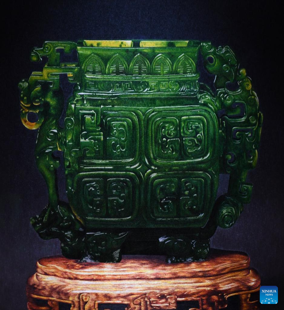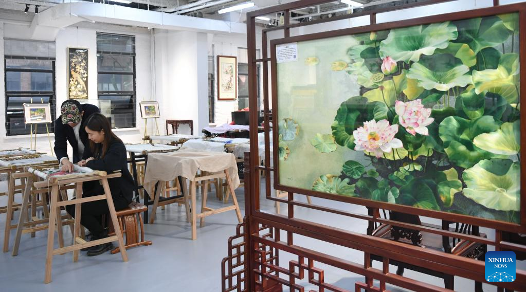 Wang Xinyuan arranges Guangzhou embroidery artworks at his studio in Liwan District of Guangzhou, south China's Guangdong Province, Dec. 6, 2022. (Xinhua/Deng Hua)