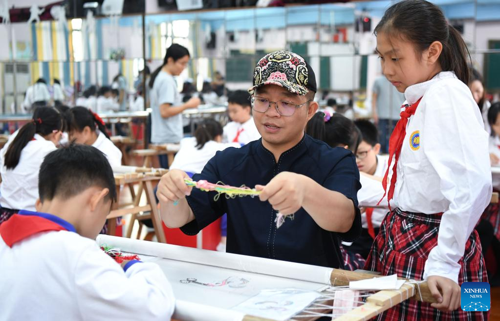 Wang Xinyuan guides students in a class on Guangzhou embroidery at a primary school in Liwan District of Guangzhou, south China's Guangdong Province, Oct. 12, 2022. (Xinhua/Deng Hua)