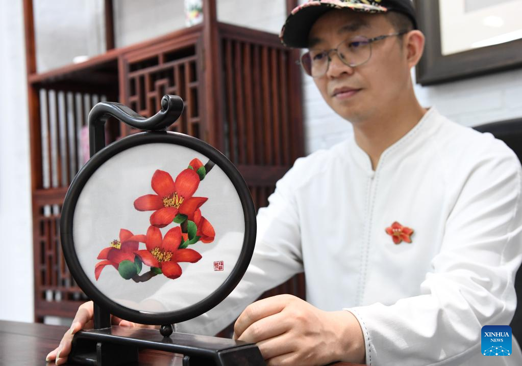 Wang Xinyuan introduces a piece of Guangzhou embroidery artwork on silk cotton flowers at his studio in Liwan District of Guangzhou, south China's Guangdong Province, April 4, 2023. (Xinhua/Deng Hua)