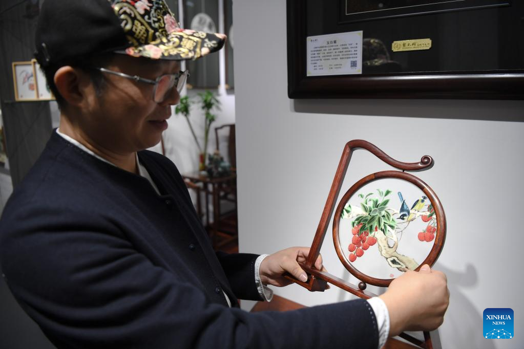 Wang Xinyuan shows a creative cultural product of Guangzhou embroidery at his studio in Liwan District of Guangzhou, south China's Guangdong Province, Dec. 6, 2022. (Xinhua/Deng Hua)