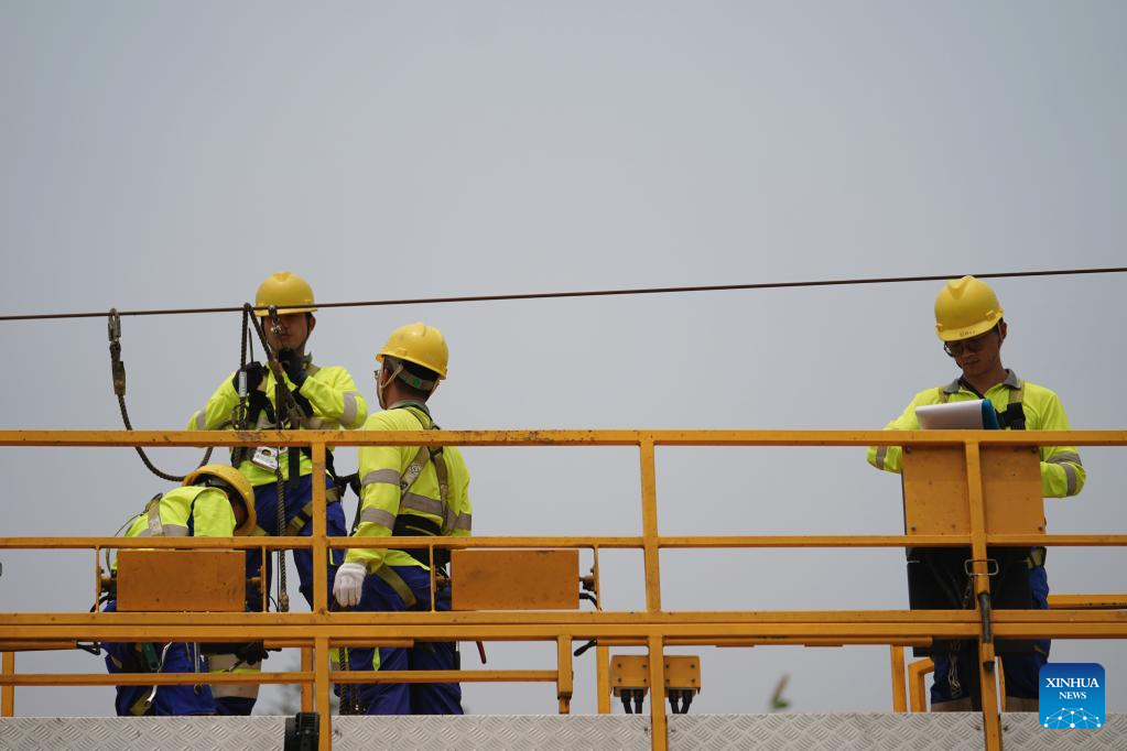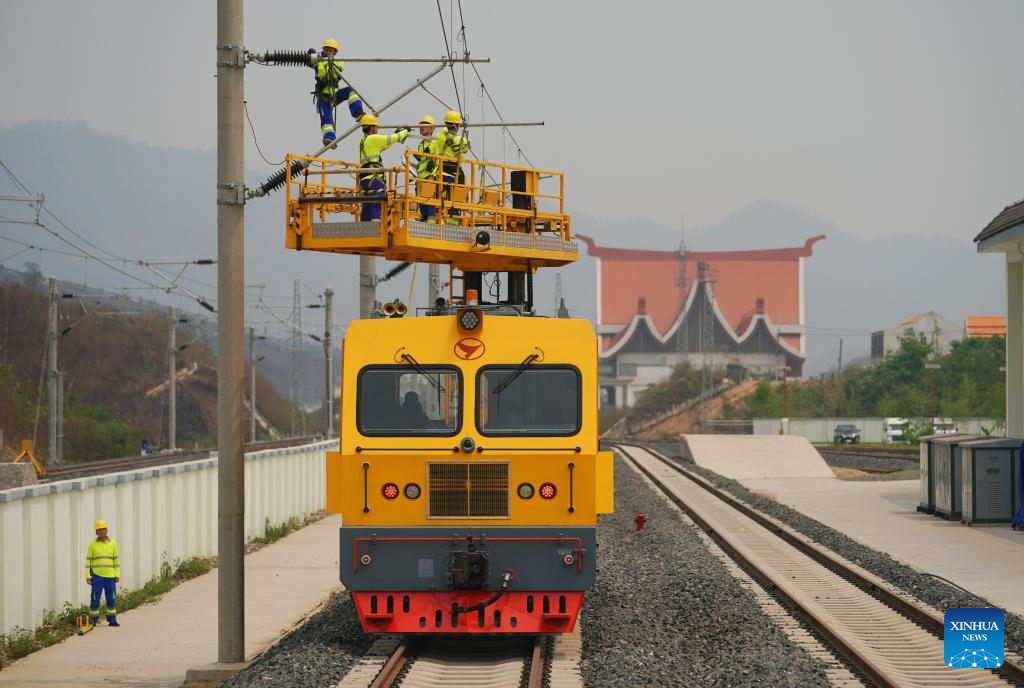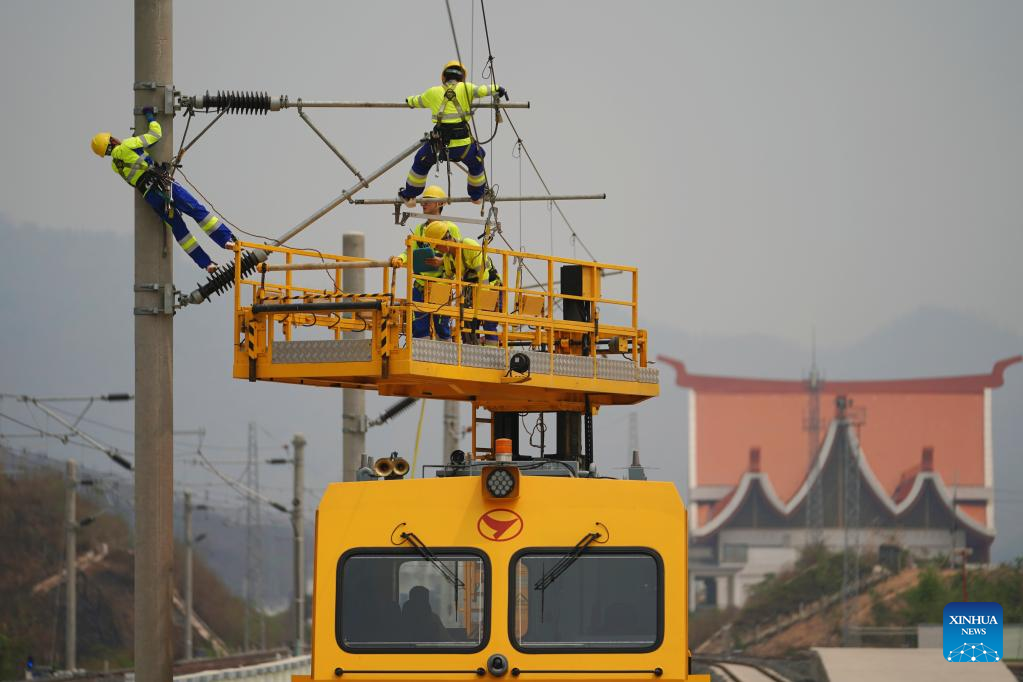 Railway staff members participate in a maintenance drill of the overhead contact system near the Luang Prabang station of the China-Laos Railway in Luang Prabang, Laos, on April 17, 2023. (Xinhua/Xing Guangli)