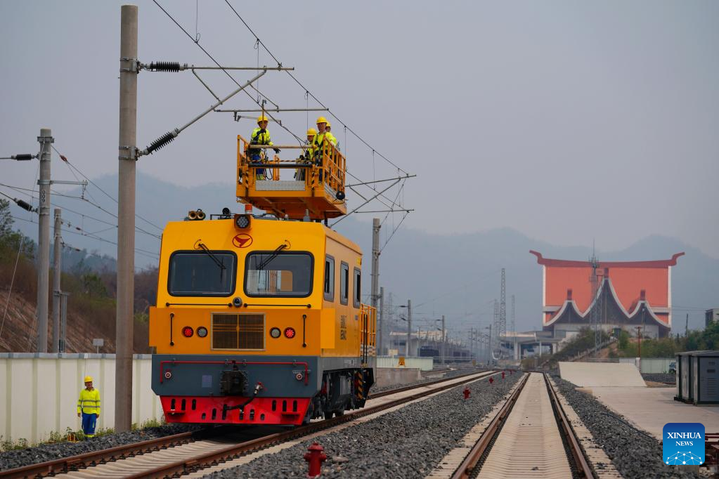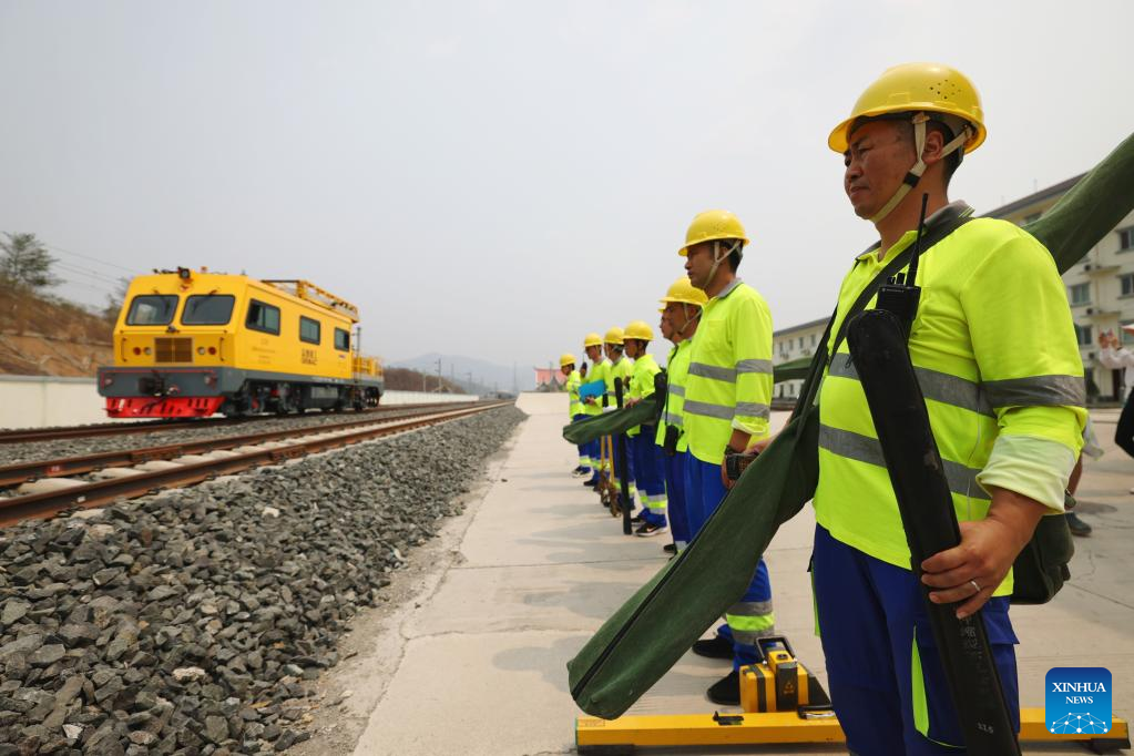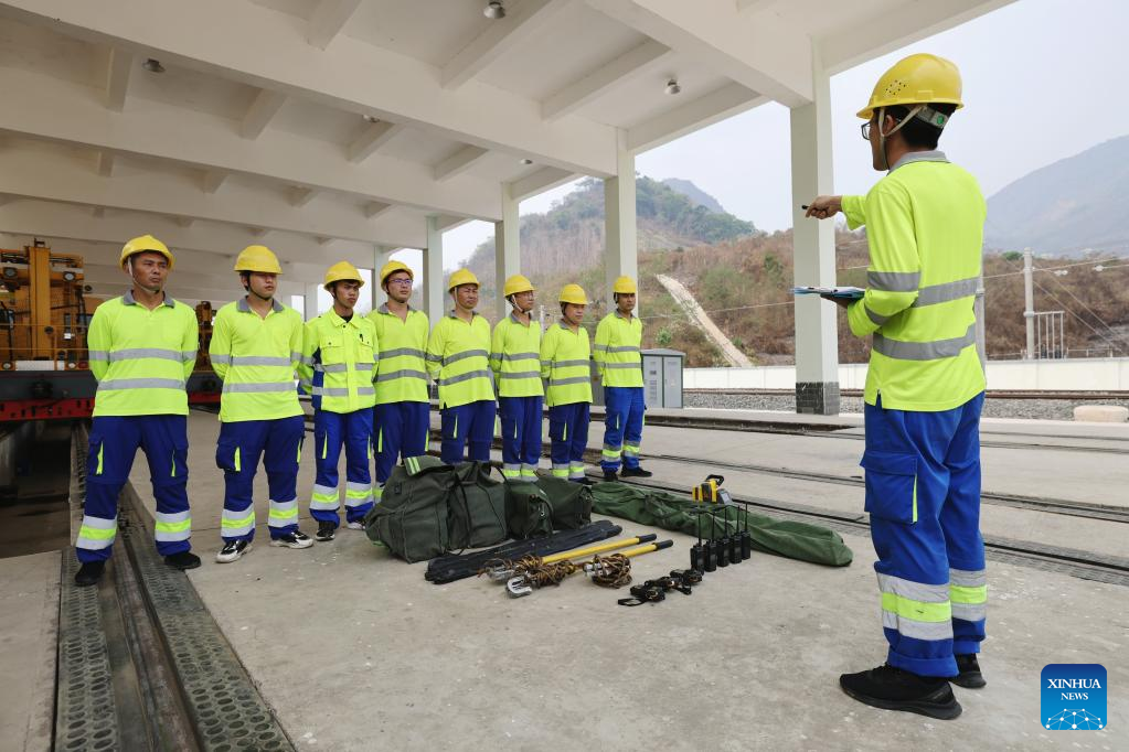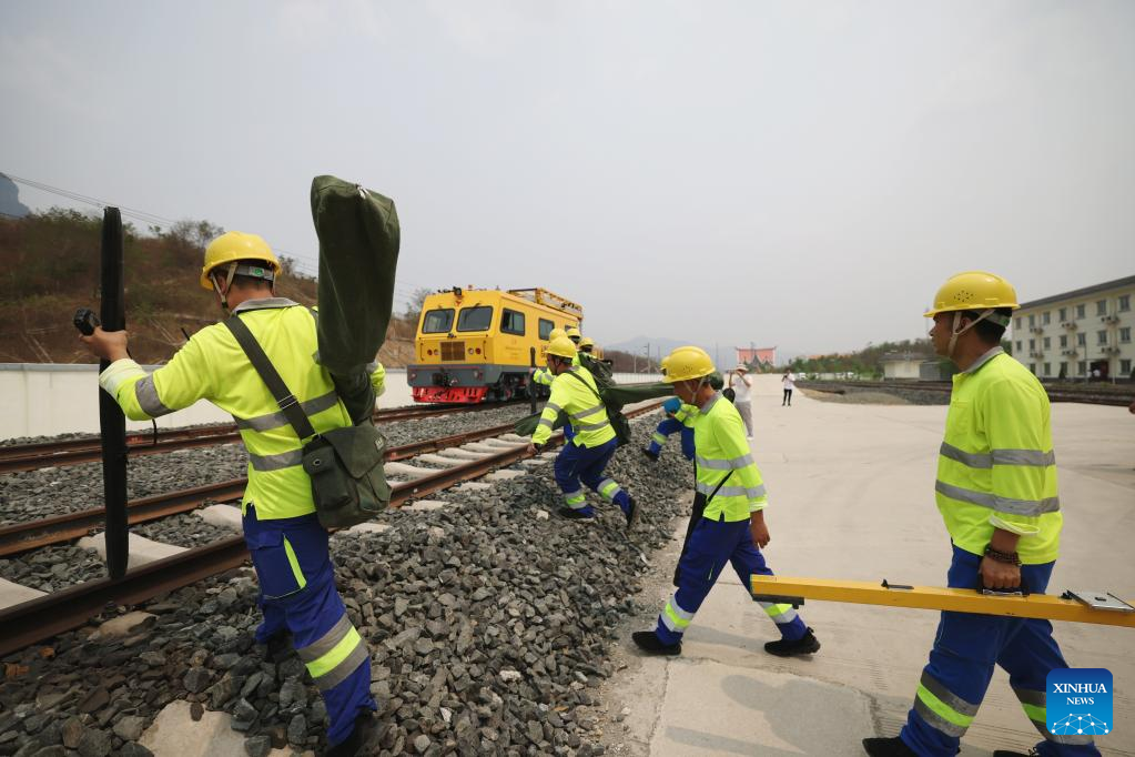 Railway staff members participate in maintenance drill near Luang Prabang station of China-Laos Railway