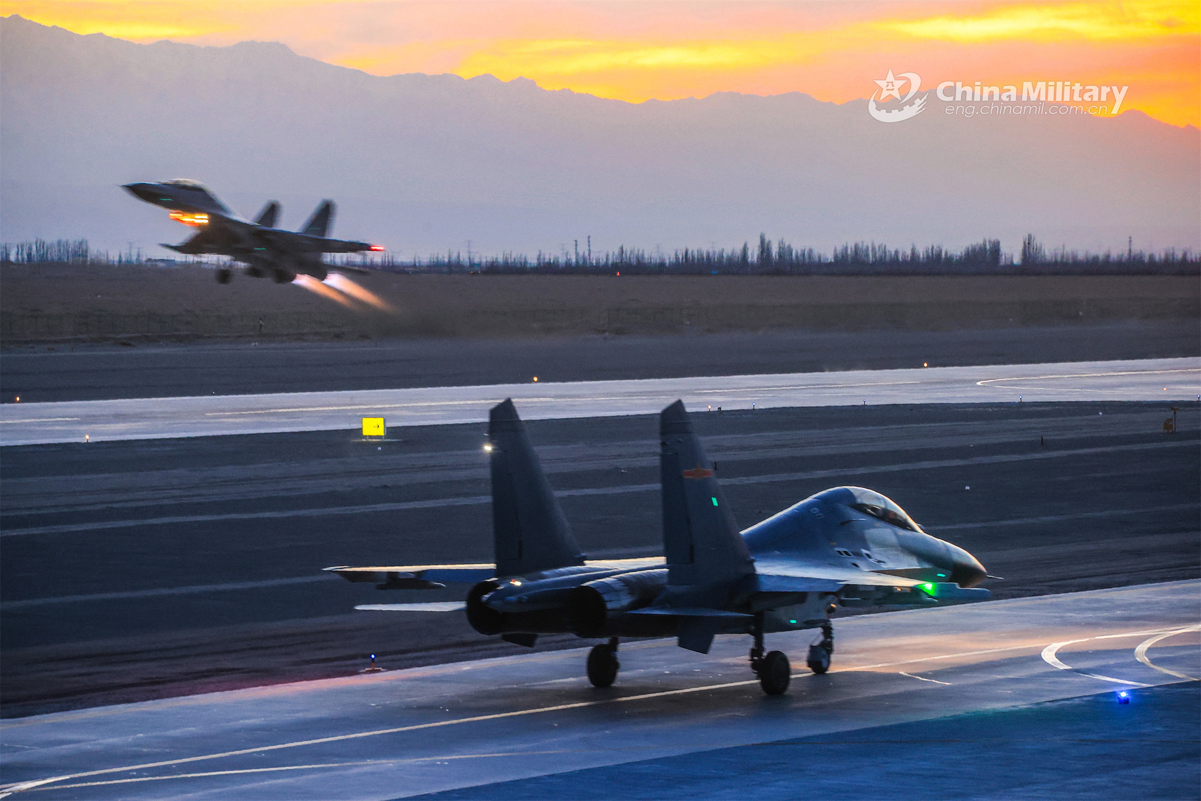 Fighter jets attached to an aviation brigade of the air force take off in succession at sunset during a round-the-clock flight training exercise on March 31, 2023. (eng.chinamil.com.cn/Photo by Cui Baoliang)
