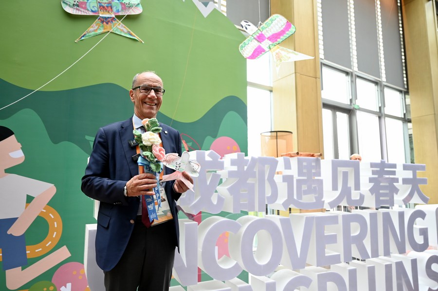 Leonz Eder, FISU acting president, poses for photos during a visit to a venue at Dong'an Lake Sports Park in Chengdu, southwest China's Sichuan Province on March 28, 2023. (Photo by Liu Haiyun/Xinhua)