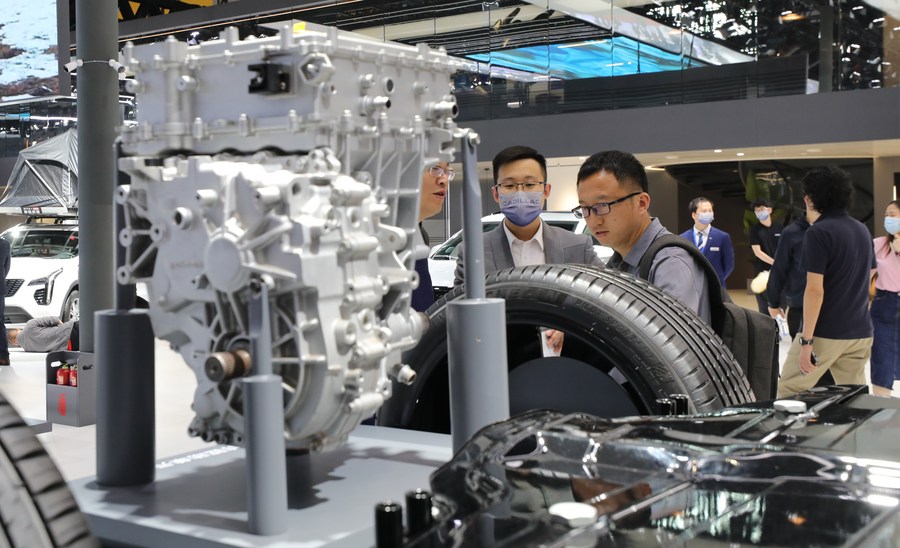 Visitors discuss while examining an NEV platform of Cadillac at the 20th Shanghai International Automobile Industry Exhibition in east China's Shanghai, April 18, 2023. (Xinhua/Fang Zhe)