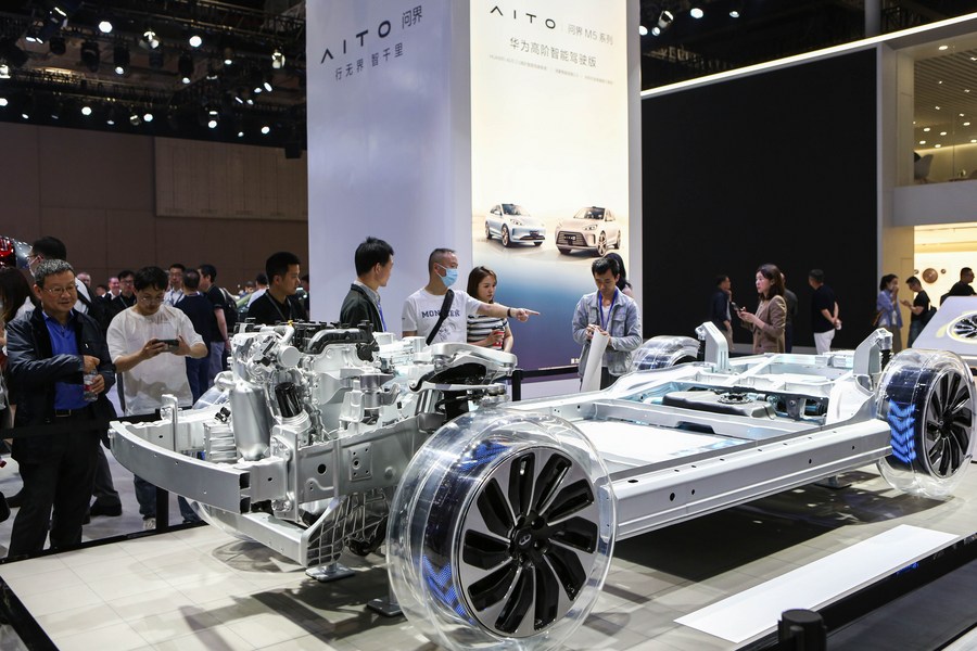 An intelligent extended driving range 4MATIC platform of Aito M5 is displayed at the 20th Shanghai International Automobile Industry Exhibition in east China's Shanghai, April 18, 2023. (Xinhua/Xin Mengchen)
