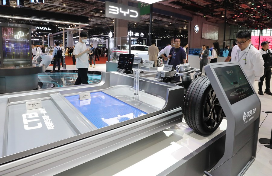 The CTB battery body integration technology of Chinese carmaker BYD is displayed at the 20th Shanghai International Automobile Industry Exhibition in east China's Shanghai, April 19, 2023.(Xinhua/Fang Zhe)