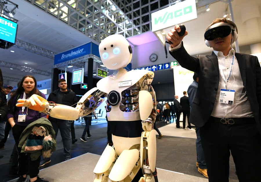 An intelligent robot imitates the gesture of a man during the Hannover Messe in Hannover, Germany, on April 18, 2023. (Xinhua/Ren Pengfei)