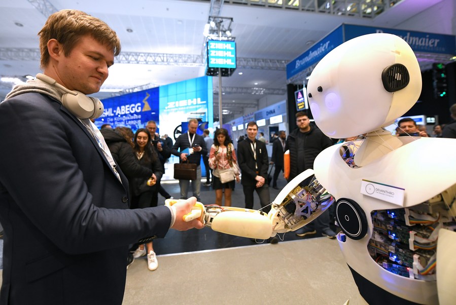 A man shakes hands with an intelligent robot during the Hannover Messe in Hannover, Germany, on April 18, 2023. (Xinhua/Ren Pengfei)
