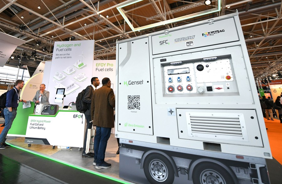 People look at a generator using hydrogen energy during the Hannover Messe in Hannover, Germany, on April 17, 2023. (Xinhua/Ren Pengfei)