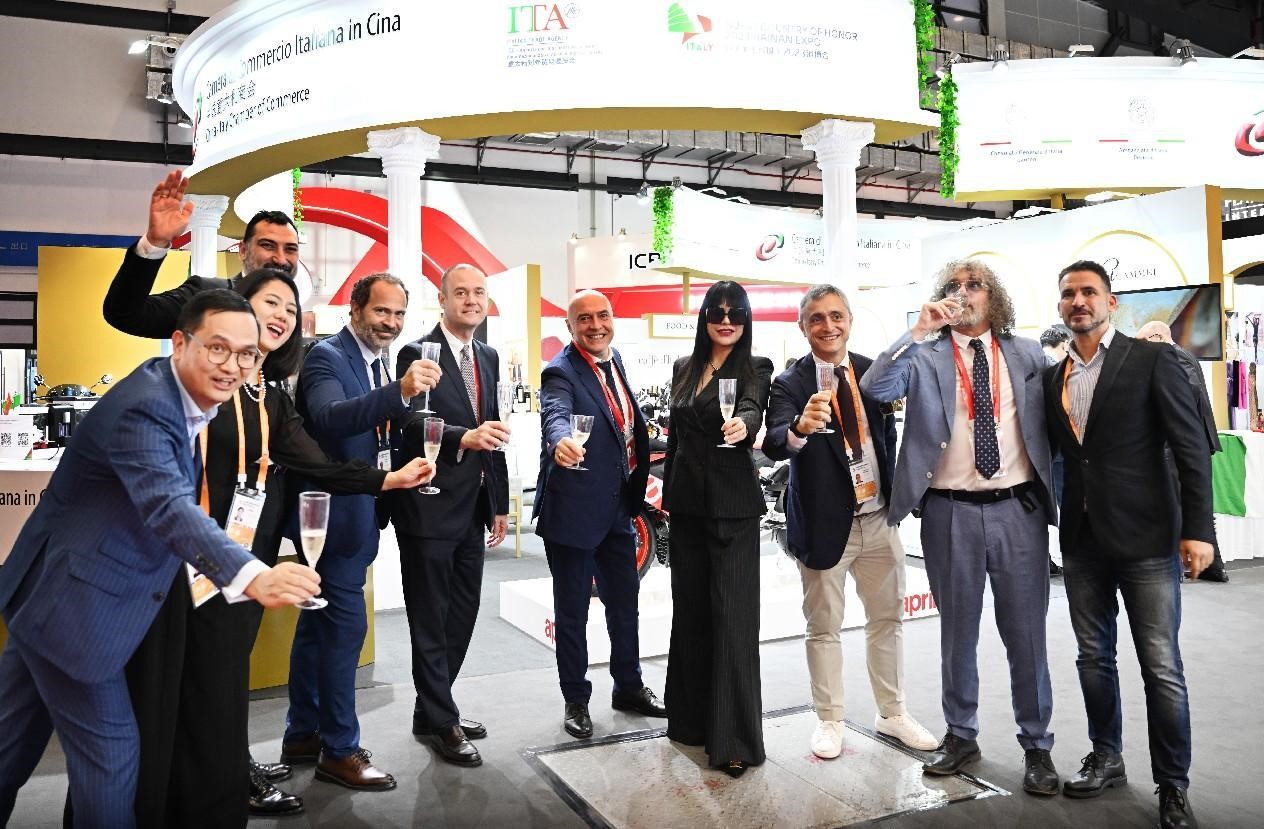 A foreigner introduces shell carving techniques to Chinese visitors at the booth of Italy at the Hainan International Convention and Exhibition Center, Haikou, south China's Hainan province, April 11, 2023. (People's Daily Online/Su Bikun)