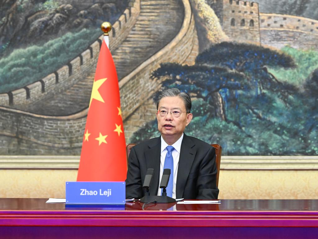 BEIJING, April 19 (Xinhua) -- Zhao Leji, chairman of the Standing Committee of the National People's Congress (NPC), on Wednesday held talks with the president of the Uruguayan House of Representatives, Sebastian Andujar, via video link.