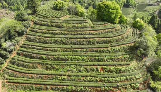 Photo taken by a drone on April 7, 2023 shows people harvesting tea leaves on a mountain in Wuyishan city, southeast China's Fujian Province. (Photo taken by Qiu Ruquan and released by Xinhua)