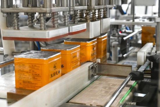 Photo taken on April 11, 2023 shows jasmine tea products on the production line of a factory of a tea import and export company in Fuzhou, southeast China's Fujian Province. (Xinhua/Zhou Yi)