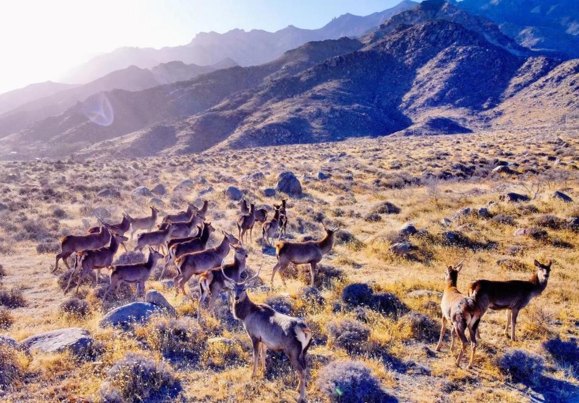 "Look! There are bharals on our right side!" Ge Yihong shouted on a vehicle heading to Helan Mountain in northwest China's Ningxia Hui autonomous region. Three bharals were drinking water leisurely by a creek. In the distance, there was Helan Mountain covered in a shade of green.