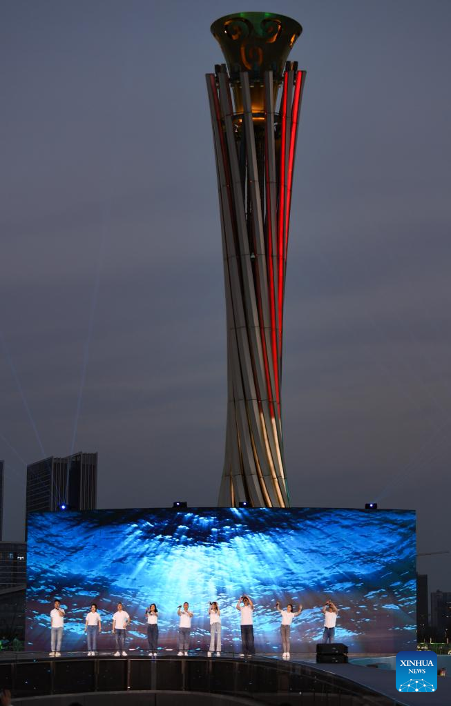 Olympic diving champion Shi Tingmao (4th L) sings a song on the 100-day countdown event for the Chengdu 2021 FISU World University Games at Dong'an Lake Sports Park in Chengdu, southwest China's Sichuan Province, April 19, 2023. (Xinhua/Wang Xi)
