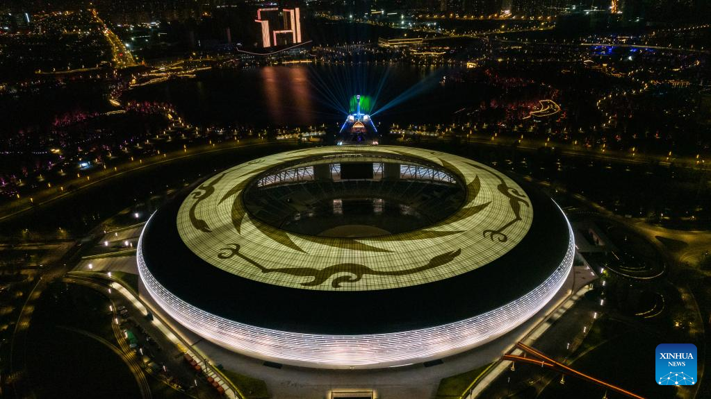 Photo taken on April 19, 2023 shows the stadium for the opening ceremony and cauldron in the light show for 100-day countdown to the Chengdu 2021 FISU World University Games at Dong'an Lake Sports Park in Chengdu, southwest China's Sichuan Province. (Xinhua/Shen Bohan)