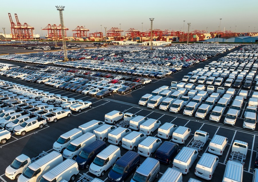 This aerial photo taken on March 13, 2023 shows vehicles at a terminal of Taicang Port, east China's Jiangsu Province. (Xinhua/Li Bo)