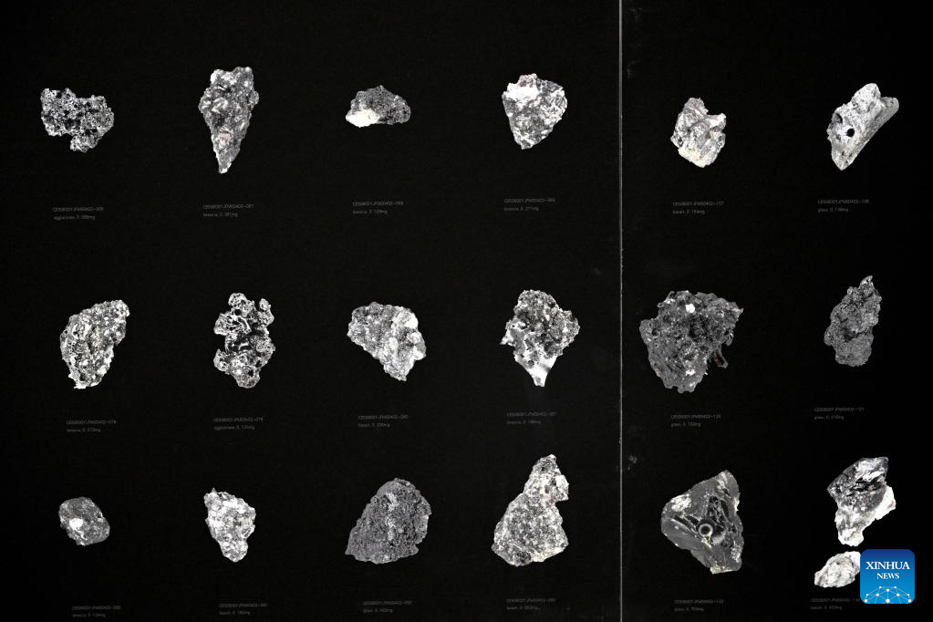 This photo taken on April 19, 2023 shows focus stacking micrographs of lunar soil particles displayed at an exhibition themed on lunar soil research achievements in University of Science and Technology of China, in Hefei, east China's Anhui Province. (Xinhua)