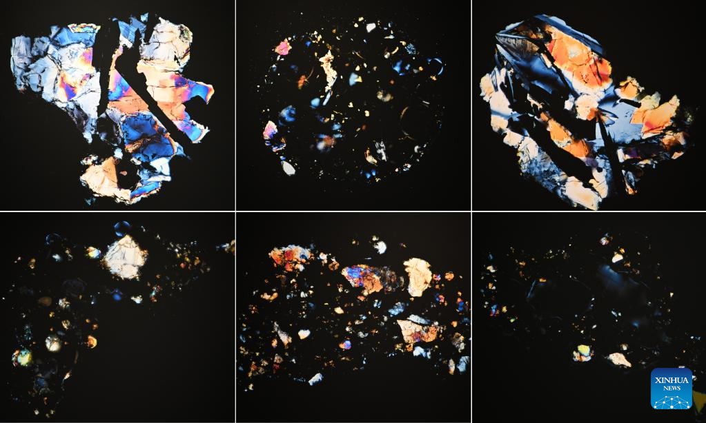 This combo photo shows cross-polarized micrographs of different lunar soil particles displayed at an exhibition themed on lunar soil research achievements in University of Science and Technology of China, in Hefei, east China's Anhui Province on April 19, 2023. (Xinhua)