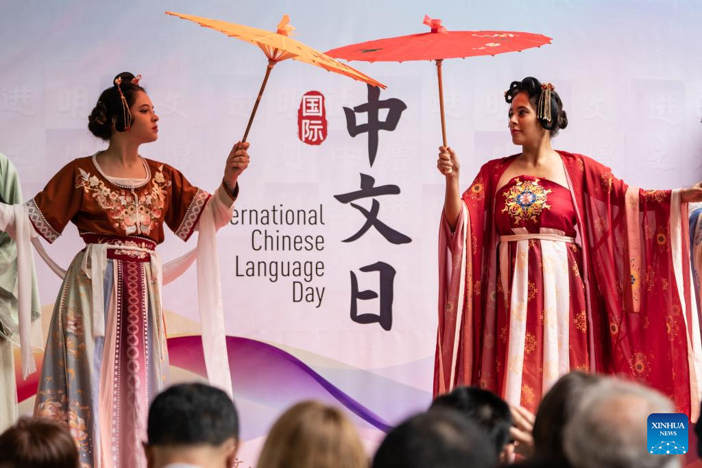 Performers demonstrate hanfu, a type of traditional clothing of the Han ethnic group in China, during an event celebrating the upcoming UN Chinese Language Day in Rio de Janeiro, Brazil, on April 19, 2023. The UN Chinese Language Day is observed every year on or around April 20, when the contribution of Chinese literature, poetry, and language to world culture is highlighted. (Xinhua/Wang Tiancong)
