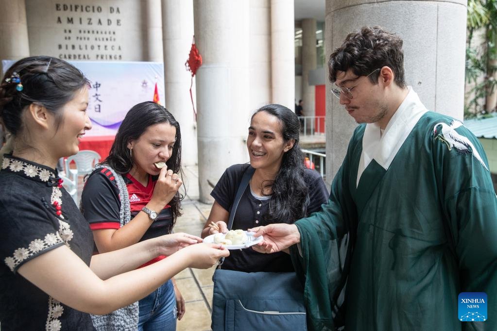 People taste Chinese food during an event celebrating the upcoming UN Chinese Language Day in Rio de Janeiro, Brazil, on April 19, 2023. The UN Chinese Language Day is observed every year on or around April 20, when the contribution of Chinese literature, poetry, and language to world culture is highlighted. (Xinhua/Wang Tiancong)