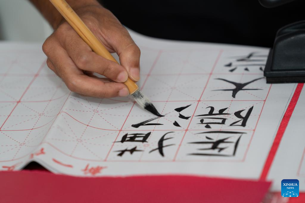 A person writes Chinese calligraphy during an event celebrating the upcoming UN Chinese Language Day in Rio de Janeiro, Brazil, on April 19, 2023. The UN Chinese Language Day is observed every year on or around April 20, when the contribution of Chinese literature, poetry, and language to world culture is highlighted. (Xinhua/Wang Tiancong)