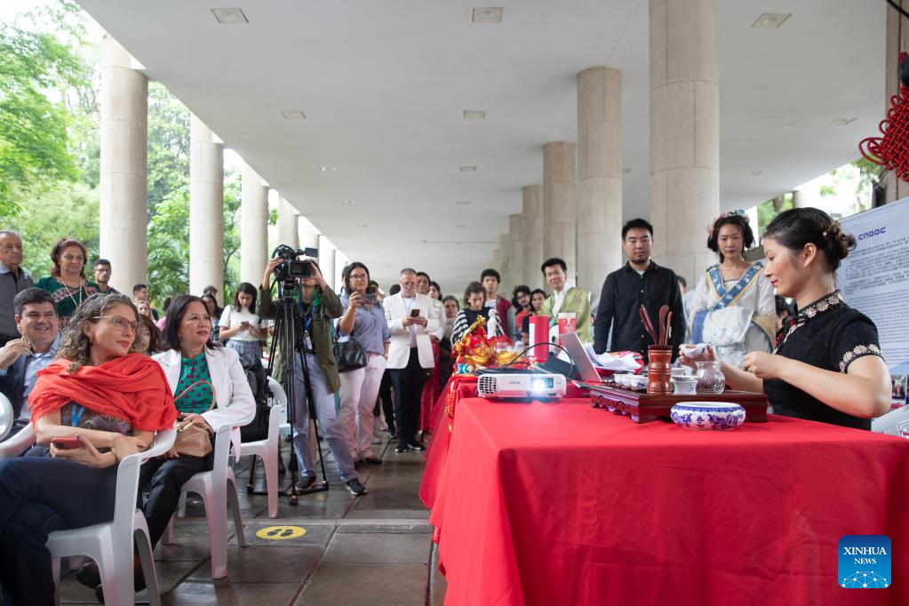 People watch a Chinese tea ceremony during an event celebrating the upcoming UN Chinese Language Day in Rio de Janeiro, Brazil, on April 19, 2023. The UN Chinese Language Day is observed every year on or around April 20, when the contribution of Chinese literature, poetry, and language to world culture is highlighted. (Xinhua/Wang Tiancong)