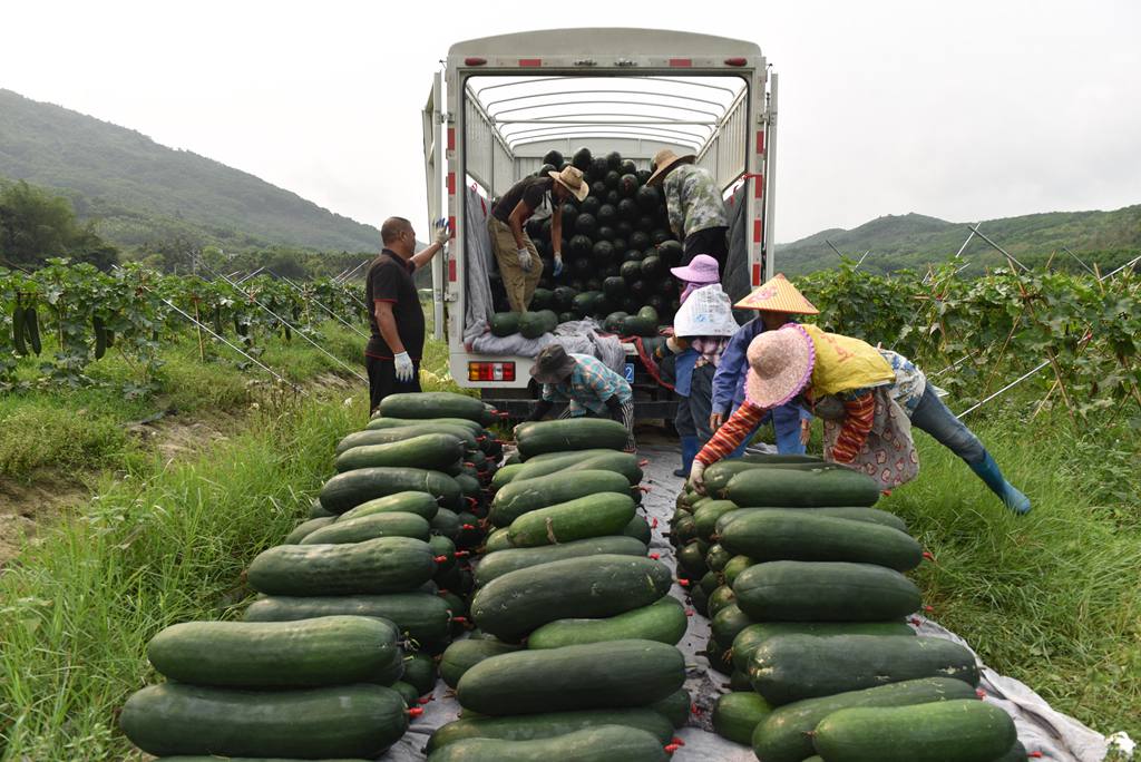 Photo shows workers loading wax gourds on a truck at a vegetable production base in Shantang village, Tunchang county, south China's Hainan Province. (Photo/Lin Xiaodan)