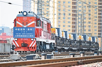 A China-Europe freight train loaded with excavators and milling machines departs from Nanyang Railway Station in Nanyang city, central China's Henan Province, to Chelyabinsk, Russia. (Photo/Wang Wei)