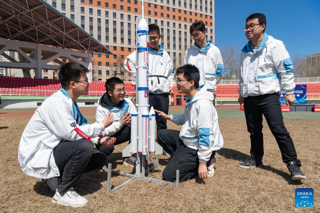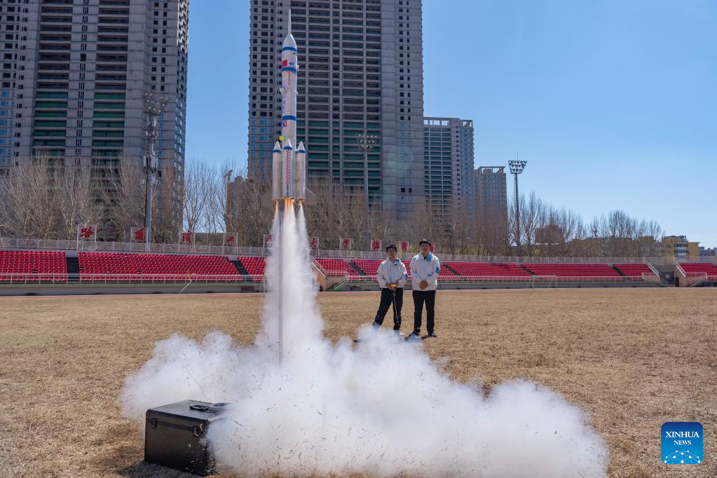 Students from the aviation model association of Harbin Institute of Technology prepares to launch a rocket on campus in Harbin, capital of northeast China's Heilongjiang Province, on April 22, 2023. Activities are held in Harbin Institute of Technology to celebrate the upcoming Space Day of China, which falls on April 24. (Xinhua/Xie Jianfei)