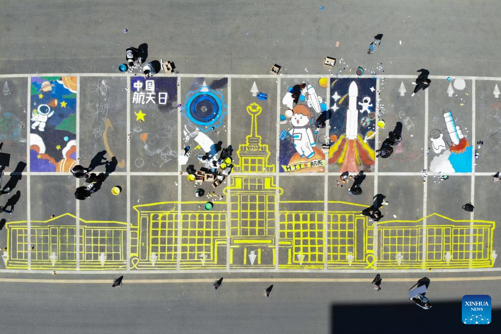 This aerial photo taken on April 22, 2023 shows students painting with the theme of space on the ground at Harbin Institute of Technology in Harbin, capital of northeast China's Heilongjiang Province. Activities are held in Harbin Institute of Technology to celebrate the upcoming Space Day of China, which falls on April 24. (Xinhua/Xie Jianfei)