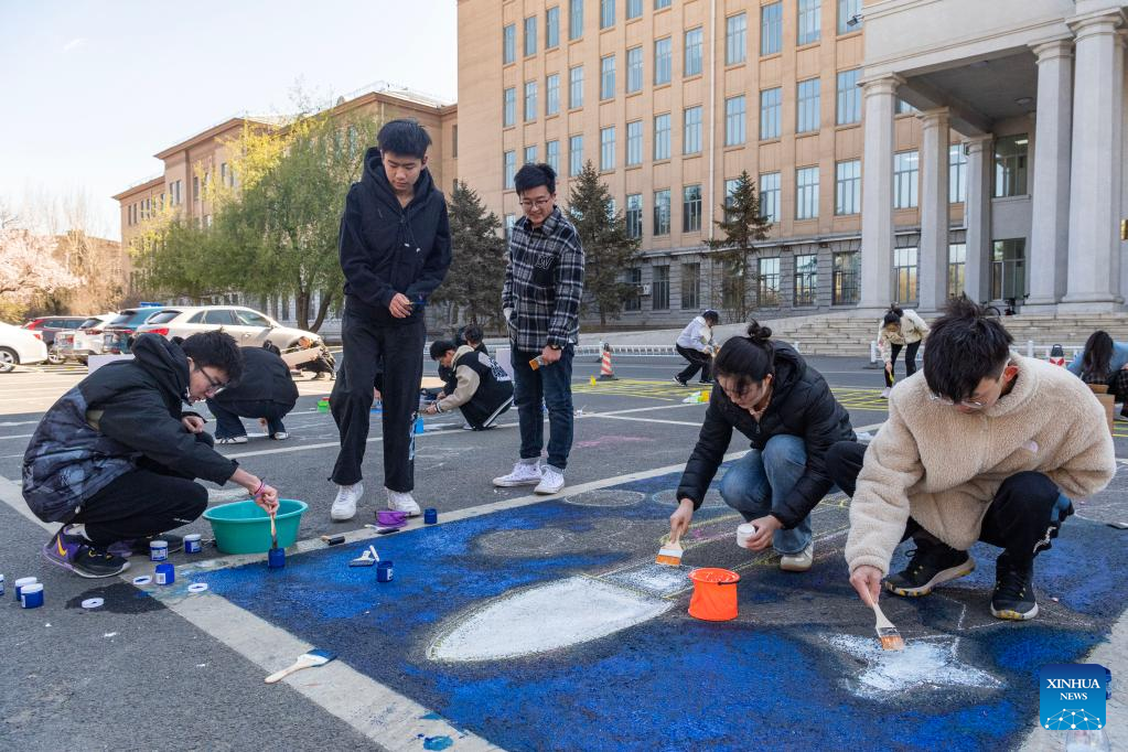 Students paint with the theme of space on the ground at Harbin Institute of Technology in Harbin, capital of northeast China's Heilongjiang Province, on April 22, 2023. Activities are held in Harbin Institute of Technology to celebrate the upcoming Space Day of China, which falls on April 24. (Xinhua/Xie Jianfei)