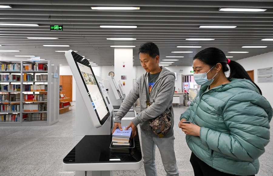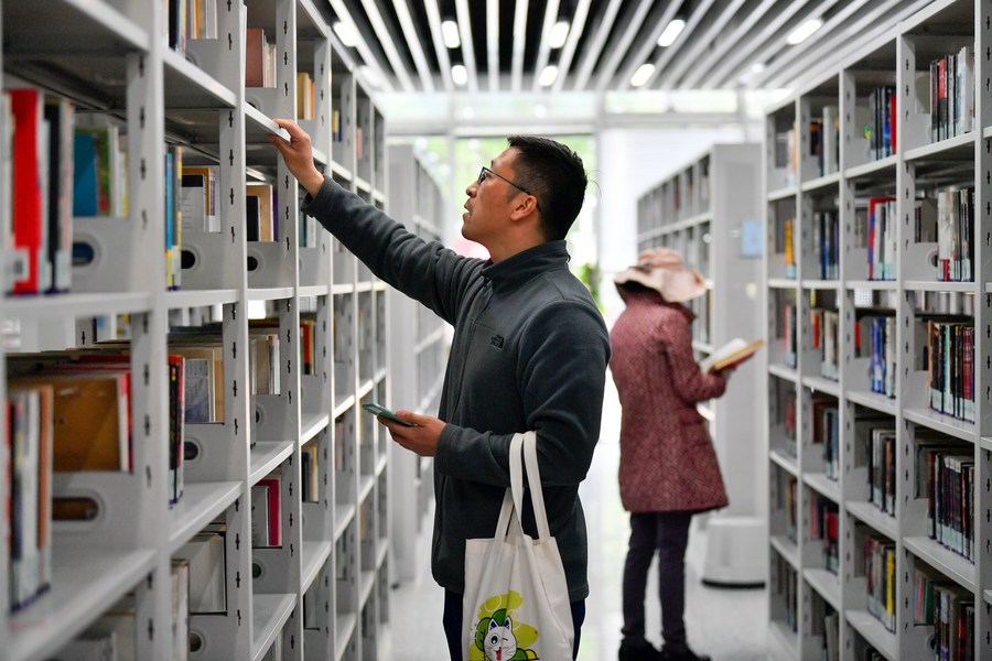People look for books at a library in the culture center of Hexi District, north China's Tianjin, April 21, 2023. (Xinhua/Sun Fanyue)