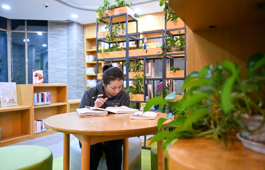 A woman returns books at a library in the culture center of Hexi District, north China's Tianjin, April 21, 2023. (Xinhua/Sun Fanyue)