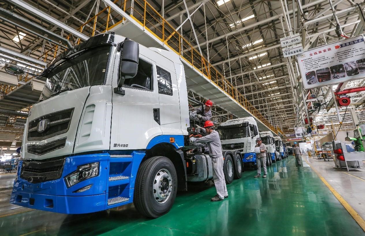 New energy heavy-duty trucks are assembled in a workshop of Hanma Technology, a publicly traded Chinese manufacturer of trucks and truck-based special vehicles in Ma'anshan, east China's Anhui province, April 20. (People's Daily Online/Wang Wensheng)
