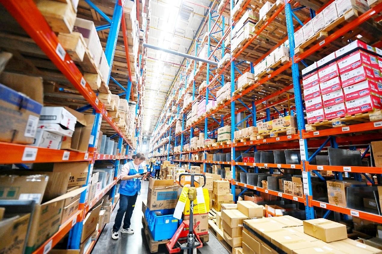 An employee manages inventory in a distribution center of a grocery chain in Xiangyang, central China's Hubei province, April 4. (People's Daily Online/Xie Yong)