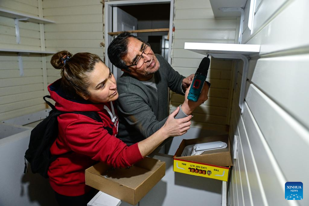 Two volunteers install shelves in a portable house designed to aid earthquake victims in Istanbul, Türkiye, April 13, 2023. The house is small but fully functional. A bathroom, a kitchen, and sleeping space are squeezed into 15 square meters to make the entire unit easy to transport, according to the builders. (Photo by Omer Kuscu/Xinhua)