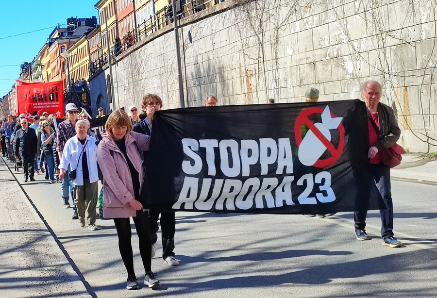 Placards and banners with messages such as "No to NATO", "NATO's war will get our children killed for a dollar," and "Stop Aurora 23" -- referring to an ongoing military exercise with 26,000 participants mainly from NATO member states currently hosted by Sweden -- were seen as the protesters moved through the city.